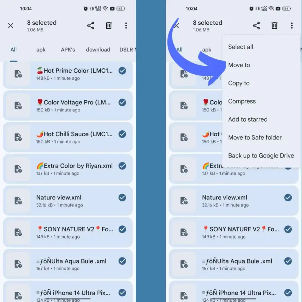 Step 4: After you get the XML File, select all the XLM file and click on the three vertical dot icon and choose move to.
